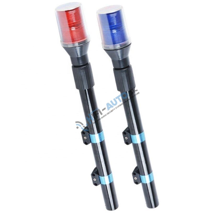 Profesionálny modrý LED maják s výrazným výstražným efektom, s teleskopickou tyčou, určený na montáž na motocykel.