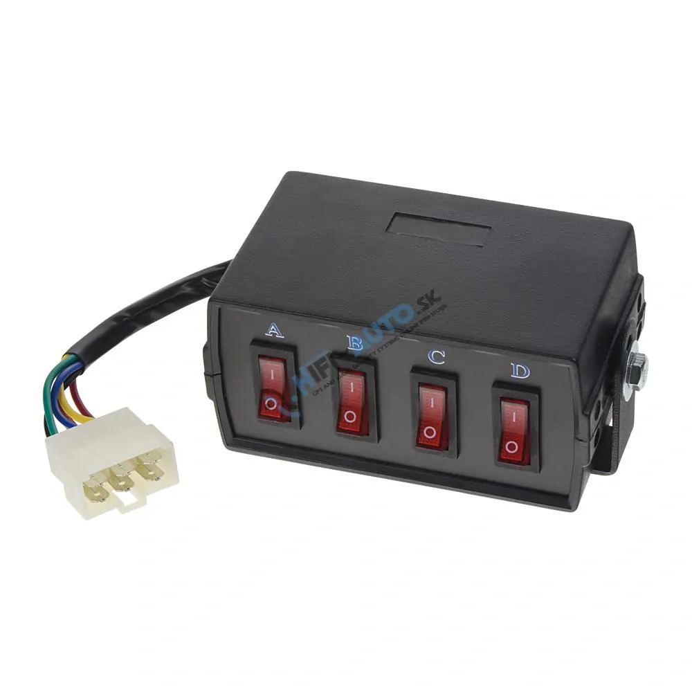 Panel so 4 prepínačmi, vhodné napr. pre prídavné doplnkové svetlá, majáky, predátory a svetelné aleje. Obsahuje 4 spínače s červeným LED podsvietením v zapnutej polohe. Upevnenie pomocou plechového držiaka (súčasť balenia).