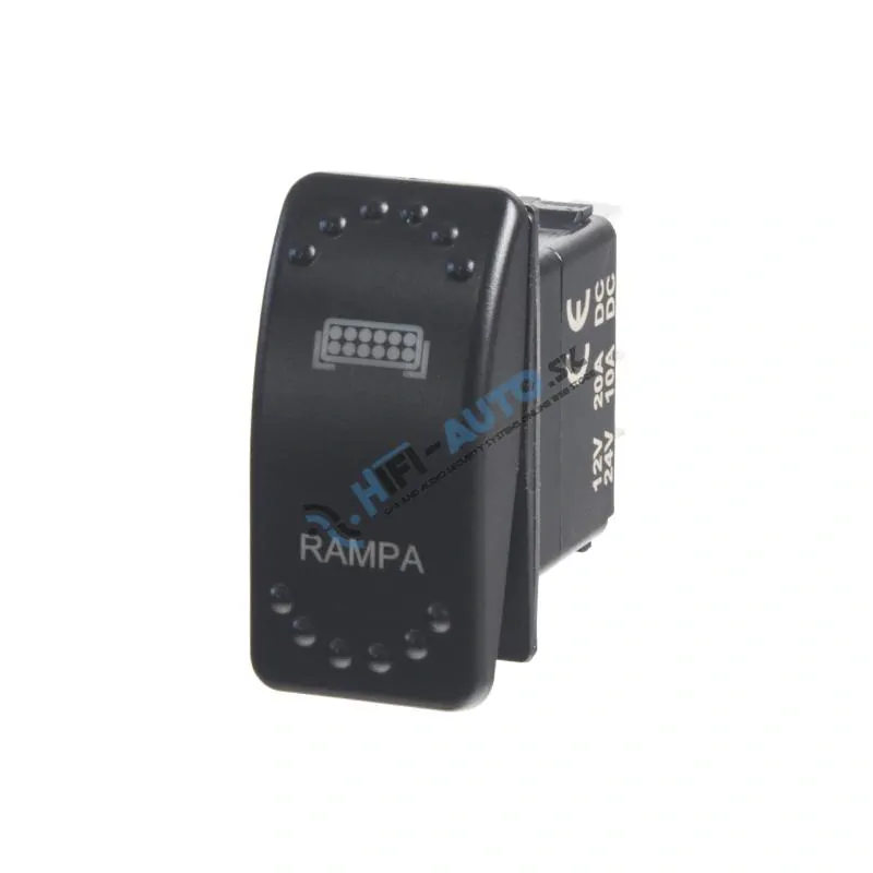 Spínač ROCKER kolískový hranatý s červeným podsvieteným symbolom rampy a nápisom RAMPA, pre napájacie napätie 12 V / 20 A - 24 V / 10 A, rozmer otvoru 37 x 21 mm, LED podsvietenie.
