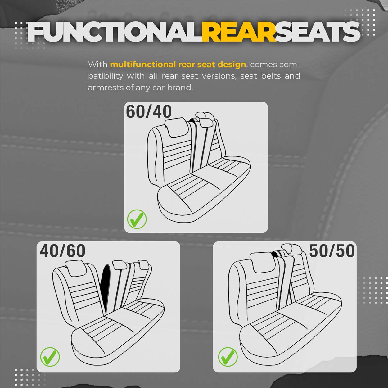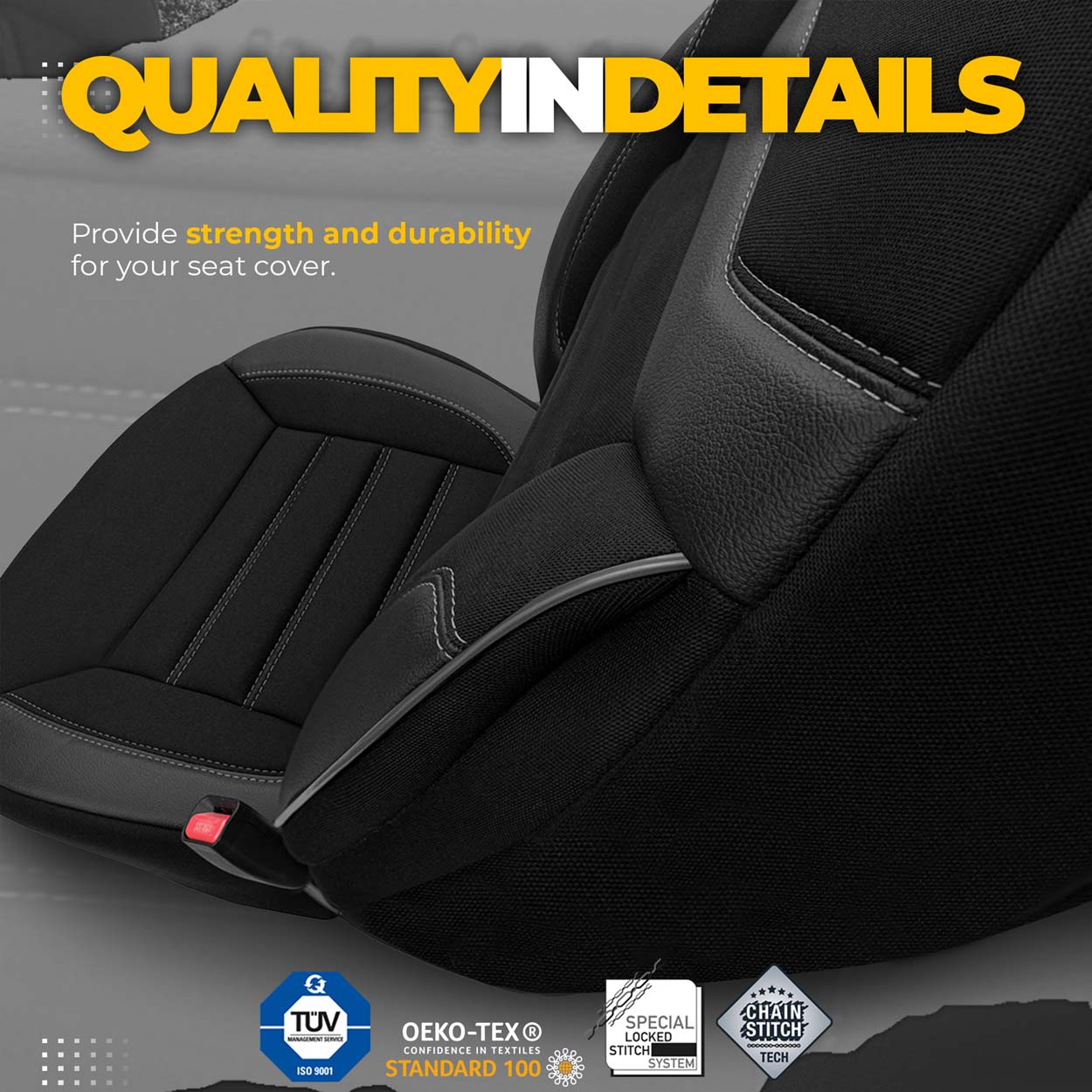 Produkt vytvorený z najkvalitnejších poťahových látok. Kombinácia najlepších materiálov a vysokého dôrazu na detail pri výrobe zaisťuje exkluzívny vzhľad a mimoriadnu odolnosť, ako aj vynikajúcu ochranu sedadiel pred nečistotami a oderom. Poťahy majú štandardne certifikovaný AIRBAGový šev, vďaka čomu sú vhodné pre autá s bočnými airbagmi v sedadlách aj štandardnými sedadlami. Vďaka špeciálnemu švu pokrývajú sedadlá úplne bez toho, aby prekážali AIRBAGOM. Samozrejme, toto riešenie je mnohokrát testované a certifikované. Všetky materiály sú plne laminované polyuretánovou penou, ktorá zabraňuje posúvaniu poťahov po sedadlách. Sedadlá úplne zakrývajú, čo predstavuje vynikajúci spôsob ochrany sedadiel pred nečistotami, sú odolné a ľahko sa čistia a vďaka módnym vzorom osviežujú interiér a zlepšujú jeho estetiku. Poťahy sú v zadnej časti vybavené zipsami, čo znamená, že sa dajú namontovať na väčšinu sedadiel dostupných na trhu (sedacie, pravostranné a ľavostranné delené pohovky). Poťahy nemajú výrezy pre bezpečnostné pásy alebo zadné opierky hlavy, pretože sú určené pre rôzne modely áut. Po starostlivom nasadení a montáži budete musieť vyvŕtať potrebné otvory sami. Poťahy sú vyrobené z materiálov laminovaných penou a podšívkou, takže sa neroztrhnú. Produkt vysokej kvality šitý v Turecku, krajine známej vysokou kvalitou šijacích zariadení.